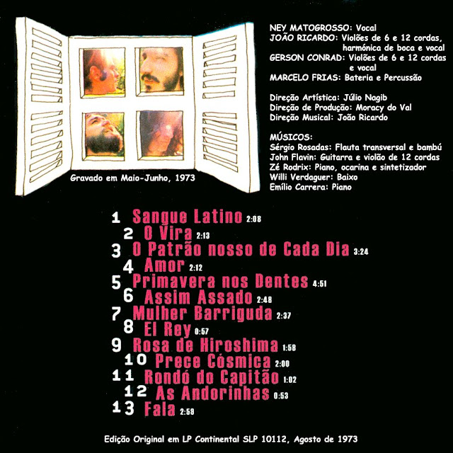 Primeiro album do grupo formado nos inícios da década de 70 por João Ricardo, foi gravado entre Maio e Junho de 1973, em sessões de seis horas diárias, durante apenas 15 dias. Editado em Agosto desse ano, “Secos & Molhados” vendeu mais de 300 mil cópias em apenas dois meses, atingindo rapidamente o milhão de cópias, o que fez do grupo um dos maiores fenómenos da MPB desses anos. João Ricardo nasceu em Portugal, em Arcozelo, Ponte de Lima, no dia 21 de Novembro de 1949. Filho do poeta e crítico teatral João Apolinário, teve uma infância fortemente influenciada pelos sons do rock and roll, desde Elvis Presley até Johnny Hallyday e Les Chats Sauvages (tinha uma predileção muito especial pelo rock francês). Conhece a música brasileira através de Miltinho e Doris Monteiro, através dos discos que o seu pai tinha em casa. Em 1963 a Beatlemania contamina-o como a tantos outros e é aí que decide ser a música o seu futuro. Um ano depois, a 28 de Março de 1964, a família muda-se para o Brasil, onde o movimento Jovem Guarda estava a viver os seus anos de ouro. João Ricardo tem apenas 14 anos, mas depressa aprende a tocar violão, além de começar a escrever alguns dos temas que anos mais tarde seriam grandes sucessos. Estuda e trabalha como jornalista no jornal Diário Popular, na TV Globo e no extinto jornal Última Hora.